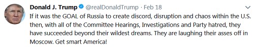 trump-tweet-021818In what feels like the 27th year of the Trump-Russia-Collusion Investigation, what we have most recently learned is that a group of Russians in St. Petersburg have been trolling us since at least 2014 (what took them so long?), playing both sides against the middle.