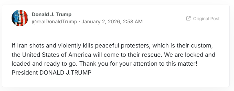 As Iran’s exiled Shah, Reza Shah Pahlavi II addressed his nation today (1/02): “To overcome the regime’s repression, there is one clear path forward: millions of people taking to the streets across cities at the same time, while simultaneously blocking key routes and major roads”