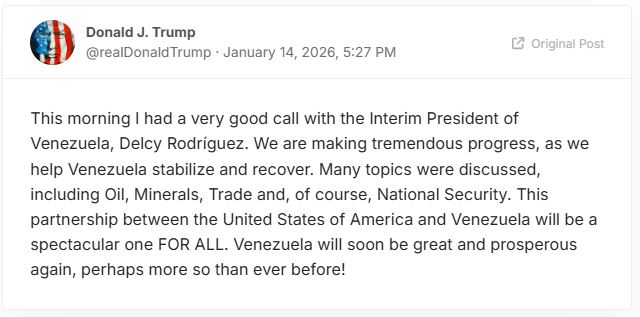 Since the US Government does not recognize the Maduro regime as legitimate, Maduro’s vice-president cannot legitimately be Venezuela’s “Interim President.”  In November 2024, Biden’s SecState Blinken announced: U.S. Recognizes Venezuela’s Opposition Candidate Edmundo González As President-Elect.