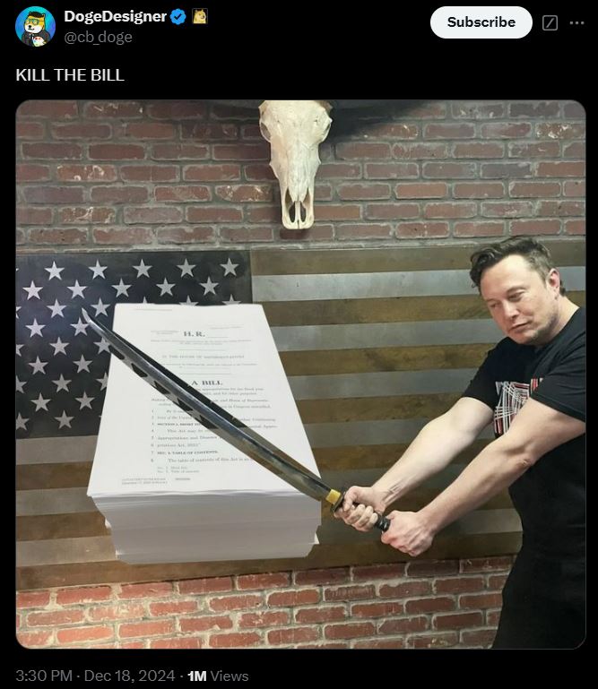 In a joint statement on X (full text below) with Vice President-elect J.D. Vance, Mr. Trump trashed the 1,500-plus-page legislation that would fund the government until March 14.