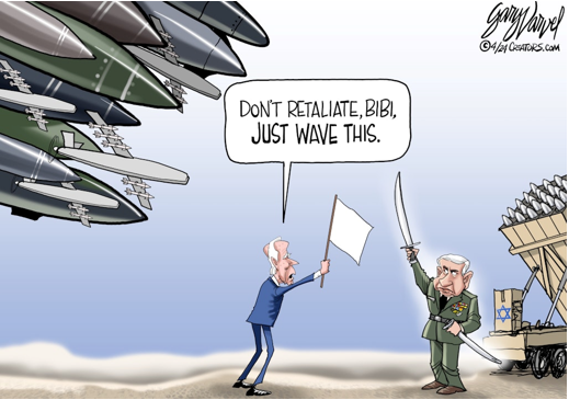 bibi-wave“Don’t.” That was Joe Biden’s one-word tough-guy warning on more than one occasion regarding whether Iran would strike Israel. It blew up in his face over the weekend as Iran launched hundreds of drones and ballistic missiles at civilian targets in Israel — the first time Iran struck Israel from its own soil, largely skipping using proxies like Hamas. Fortunately, Israel was ready and, along with U.S., British, and Jordanian assistance, foiled nearly all of the incoming fire.