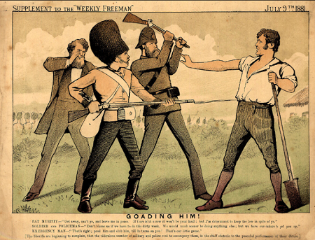 goading-himThis famous cartoon from the Irish magazine Weekly Freeman in 1881 depicts law-abiding Pat Murphy being goaded by a policeman and soldier into fighting so it can be blamed on him – with the Emergency Man behind them saying, “That's right! Prod him and club him, ‘till he turns on you!  That’s our little game.”