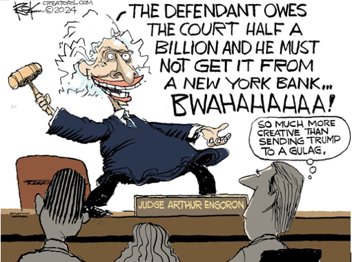 engoron-jokerOscar Wilde wrote that “moderation is a fatal thing. Nothing succeeds like excess.” Justice Arthur Engoron took that line to heart with his absurd imposition of $455 million in fines and interest against Donald Trump and his corporation.