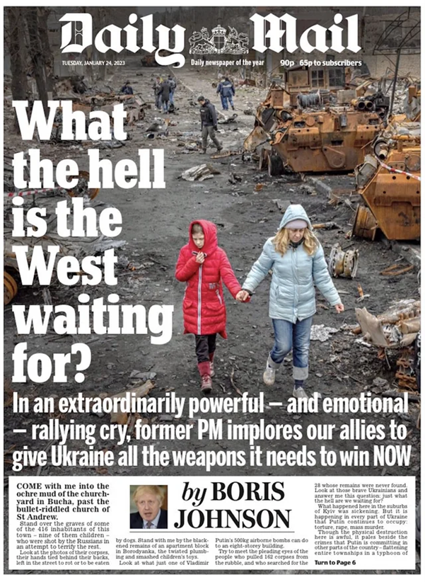 boris-wont-wait[Note by Jack Wheeler: Early yesterday morning (1/24), the London Daily Mail ran this cover story by British former (and quite possibly the future) Prime Minister Boris Johnson.  By early this morning (1/25), Germany got the message, Der Spiegal announcing: Ukraine Will Receive 80 Leopard Tanks from Germany and Other European Countries, and the Wall Street Journal reporting: White House Approves Sending Abrams Tanks to Ukraine.  Thanks, Boris!]