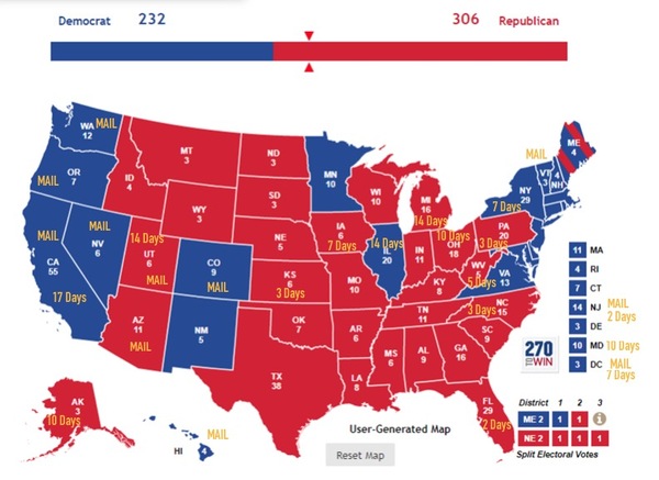 As it stands now, fewer than 40,000 votes switched from the Democrat nominee Joe Biden to Donald Trump in Pennsylvania, Georgia, and Arizona would give Trump the election 279 electoral votes to Biden’s 259.