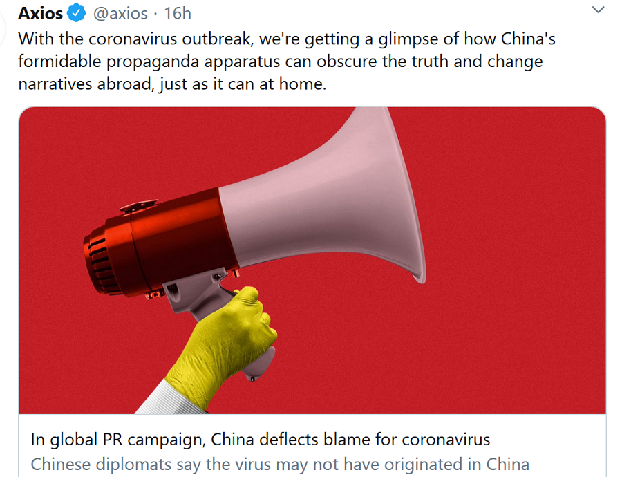 axiosIf you listened to Chinese state-run media, you'd think President Trump went to Wuhan, China and released vials of COVID-19 on groups of unsuspecting men, women and children.