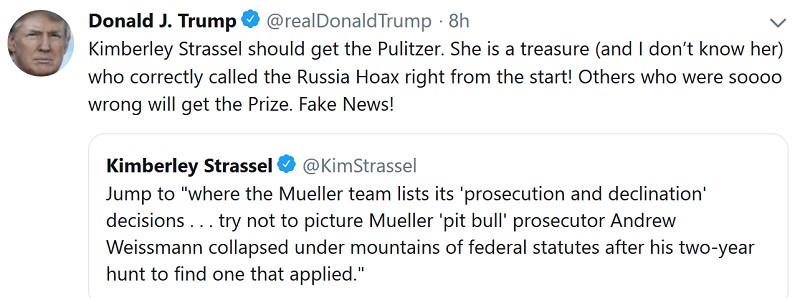 tom-fitton-tweet-on-russia-collusion-hoaxPardon me if I don’t join in the chorus of praise for Special Counsel Robert Mueller’s investigatory efforts.