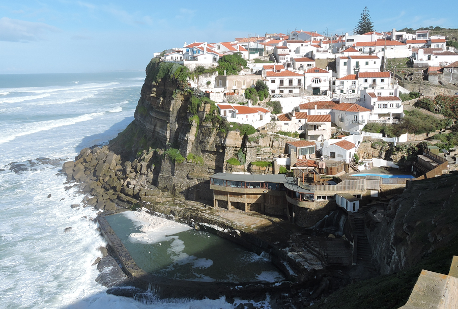 A cliff-top fishing village on the Italian Riviera? Nope, Azenhas (ah-zhane-yas) do Mar – Watermills of the Sea – is on the Portuguese Riviera. This is a magic place of fairy tale castles, thousand year-old fortresses, luxury boutique hotels, fabulous food, great wine, gorgeous beaches, and postcard-perfect scenery everywhere.