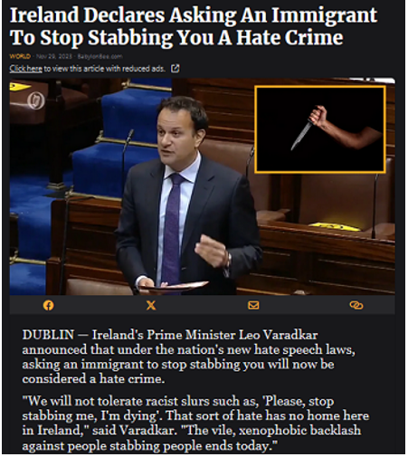 dont-ask-the-stabberThis Babylon Bee spoof is so close to the truth you don’t whether to laugh or cringe. It’s exactly why, as Skye pointed out yesterday, the Irish are finally rebelling against their woke girlieman PM doing next to nothing about the flood of immigrants running amok in their country.