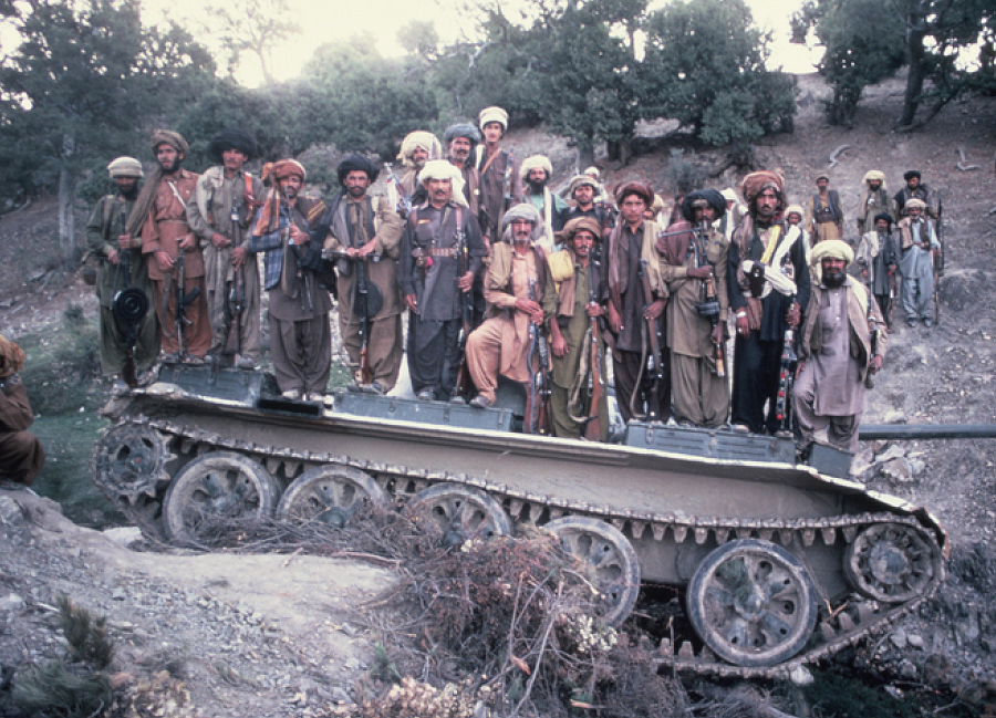 Afghan Mujahaddin with destroyed Russian T-62 tank, 1983 ©Jack Wheeler