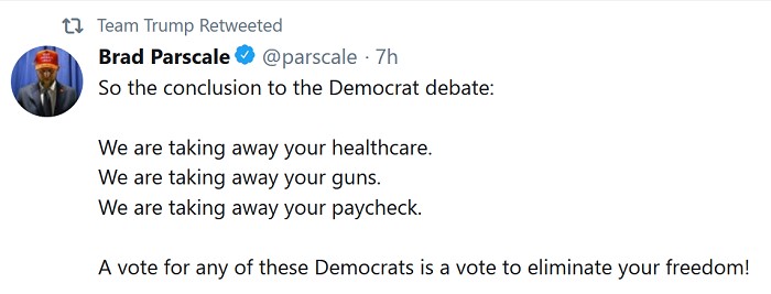 socialism-will-kill-houston I’m confident you managed to avoid watching the Dems’ circular firing squad last night (9/12), so Trump 2020 campaign manager Brad Parscale was kind enough to sum it up for you: