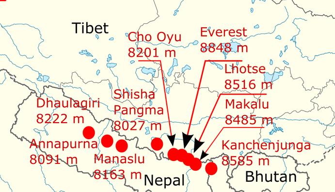 height-of-himalayan-giants We first note that the five “eight-thousanders” (over 8,000 meters high) we’ve been to so far are on Nepal’s borders, while Manaslu and Annapurna (along with Dhaulagiri, we’ll get there next week) are entirely within Nepal.  (Shisha Pangma is in Chinese Tibet.)  So we get to go completely around them.