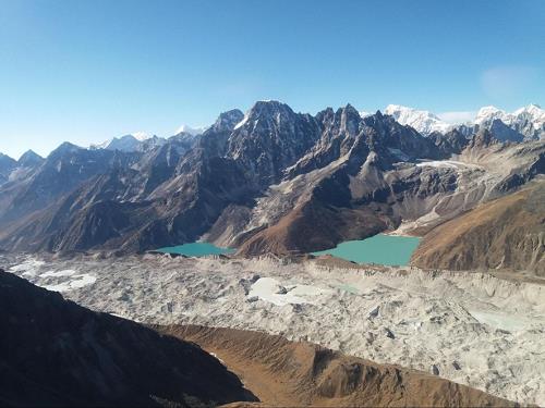 This week, we’ll explore the route to Everest and its sister peak of Lhotse via Cho Oyu in Nepal. From Cho Oyu flows the largest glacier in the Nepali Himalayas, the giant Ngozumpa Glacier which has a series of beautiful lakes, the Gokyo Lakes, alongside. That’s what you see in the photo above.