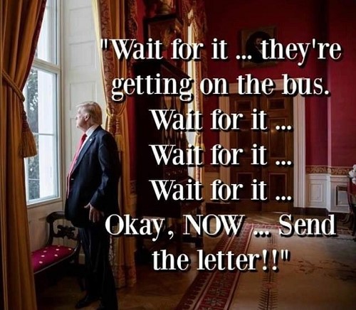 For example – Pelosi’s taxpayer-paid junket was unannounced, the public knew nothing about it, so when POTUS blew the whistle, he exposed it but waited until the Dems were in the bus on the way to Andrews: