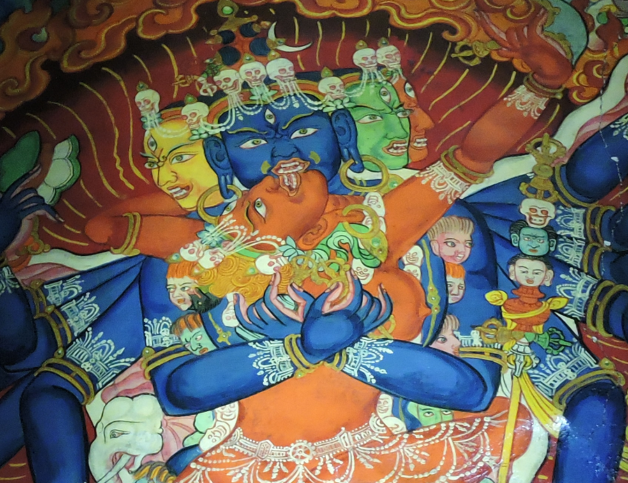 tantric-bhutanThe most fabulously exotic country on earth is the Himalayan Kingdom of Bhutan. The Bhutanese religion of Tantric Buddhism is here exemplified by a prayer hall wall painting of Yab-Yum – the physical union of Compassion and Wisdom. Male compassion is personified as the deity Samvara with a blue body, multiple faces and arms. He embraces his consort of female wisdom Vajra-varahi.