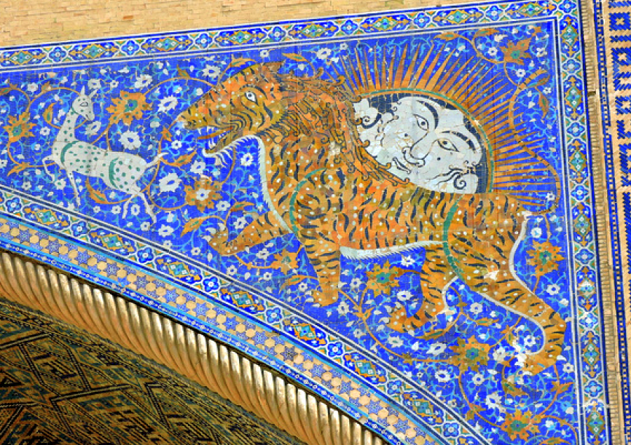 tigers-of-samarkandThe magnificent Sher-Dor Madrassa, built in the early 1600s, is part of the Registan public square complex of the ancient Silk Road oasis of Samarkand. “Sher-Dor” means “Adorned with Tigers” in Persian – flaunting Islamic blasphemy of living beings in art. Here is the mosaic depiction of a tiger chasing a deer and on its back a rising sun deity with a human face. This is honoring the pre-Islamic history of Samarkand that goes back almost 3,000 years.