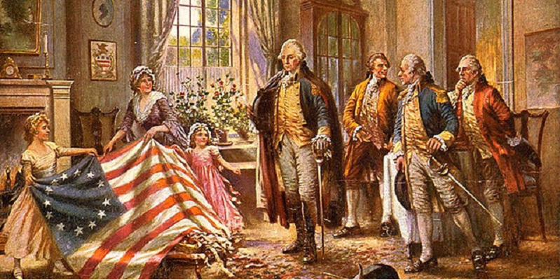 Betsy Ross showing the first American flag to George Washington