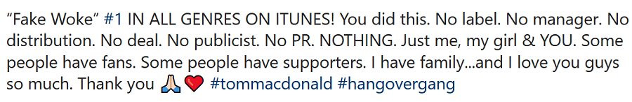 Rapper Tom McDonald’s Fake Woke was released last Friday (1/29), and the very next day it shot to #1 on the All-Genre US iTunes Song Sales Chart.