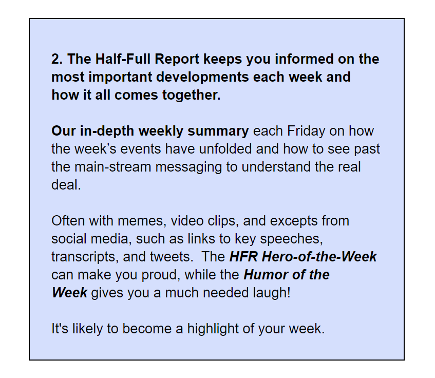 “Best information I get all week. Really look forward to Friday’s Half Full Report.”